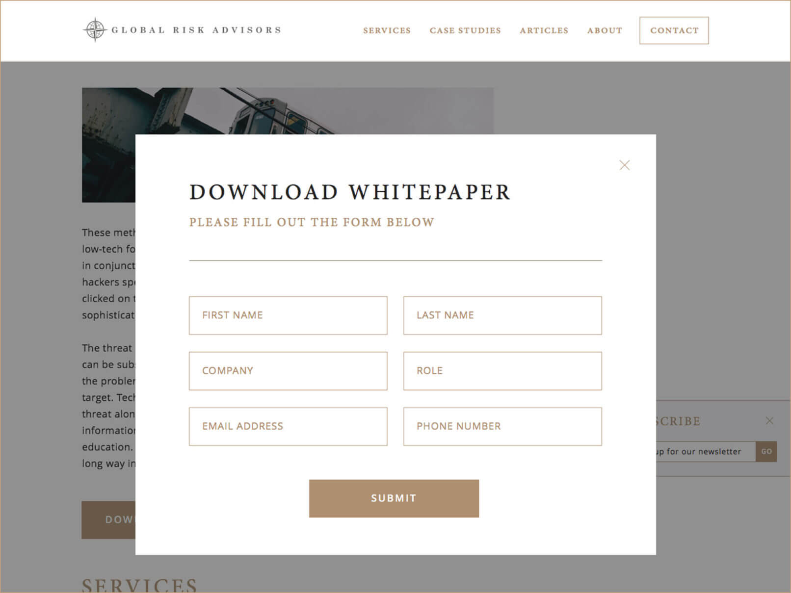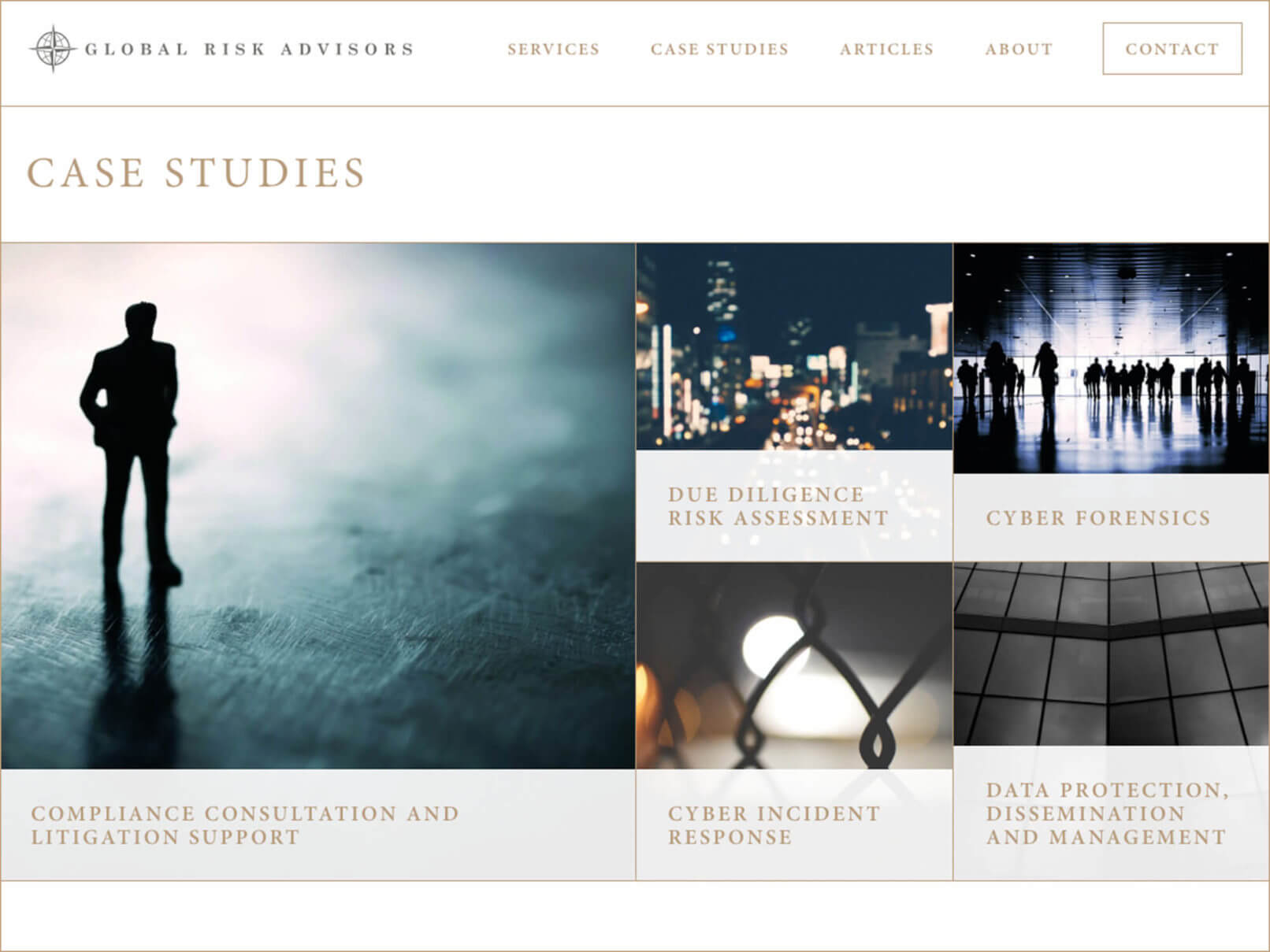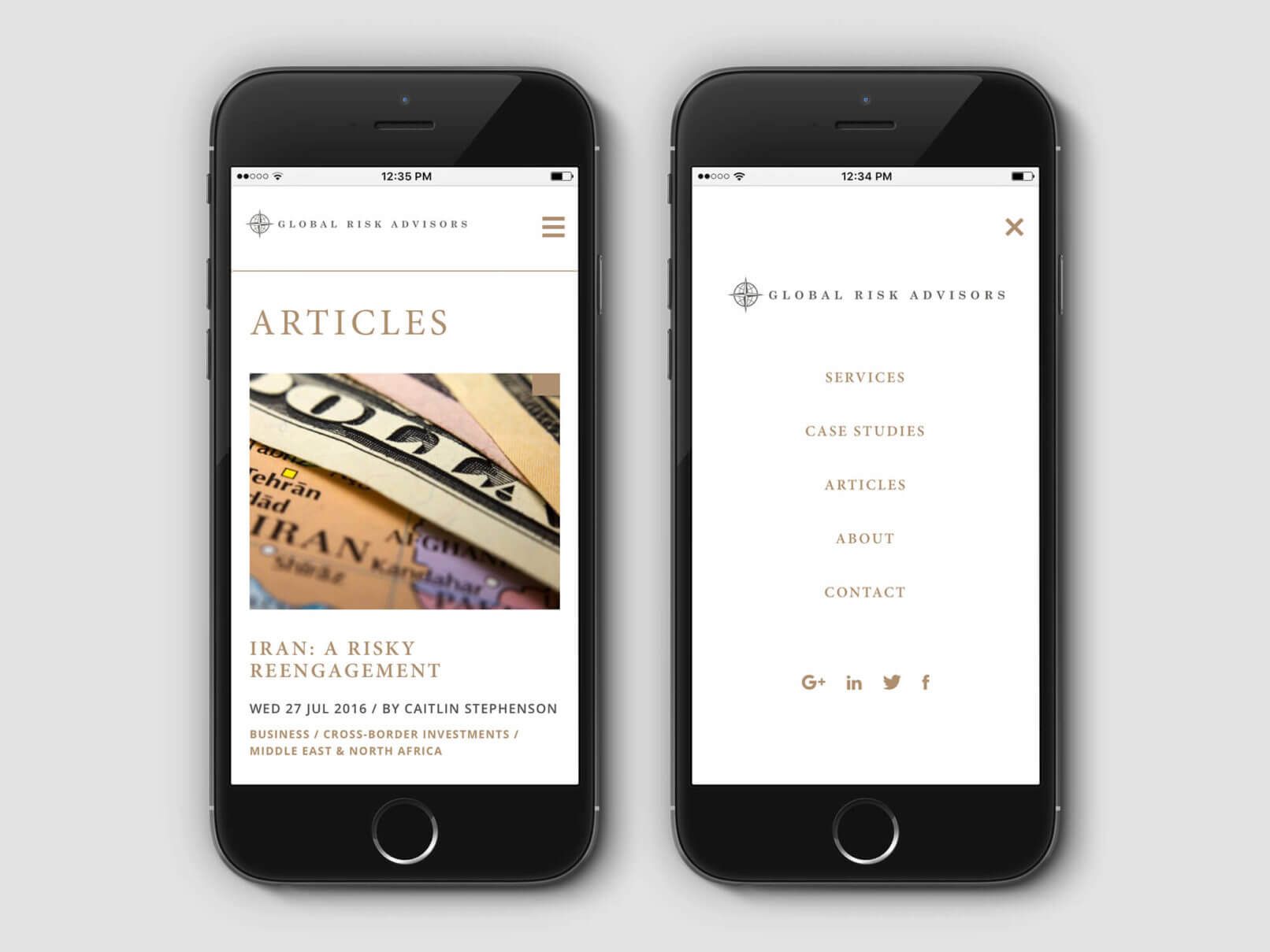 Global Risk Advisors hired Pig Iron to refresh and expand upon their existing website. Previously a one-page website with an external blog engine, the new site follows similar branding but leverages a fully responsive, custom WordPress framework with numerous pages and integrated blog functionality (Articles page). A custom download gate modal was designed, as well.