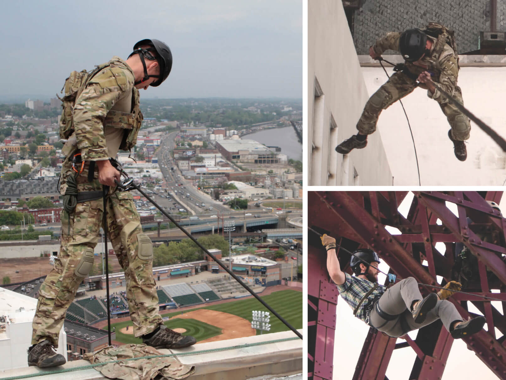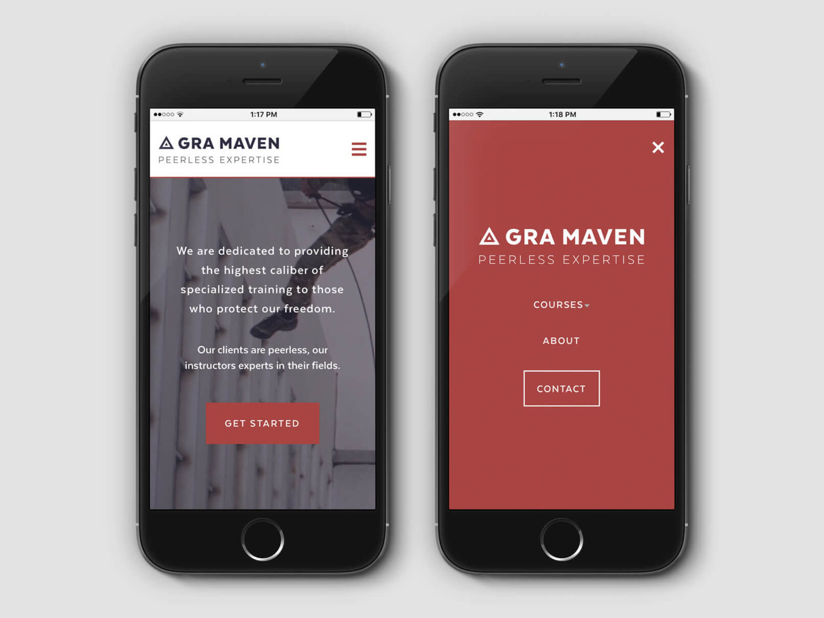 The three points of the GRA Maven logo are a military special operations reference to land, water, and air. The inset triangles build upon each other, which speaks to the training methodology found in the GRA Maven course program. The GRA Maven logo is the boldest and strongest of the three brands, paired with brand colors that are more muted. The palette has a subtle patriotic feel to it, with neutral tones that support the powerful imagery of the GRA Maven courses. We strove for balance and harmony not only within the GRA Maven brand itself, but among all three brands.