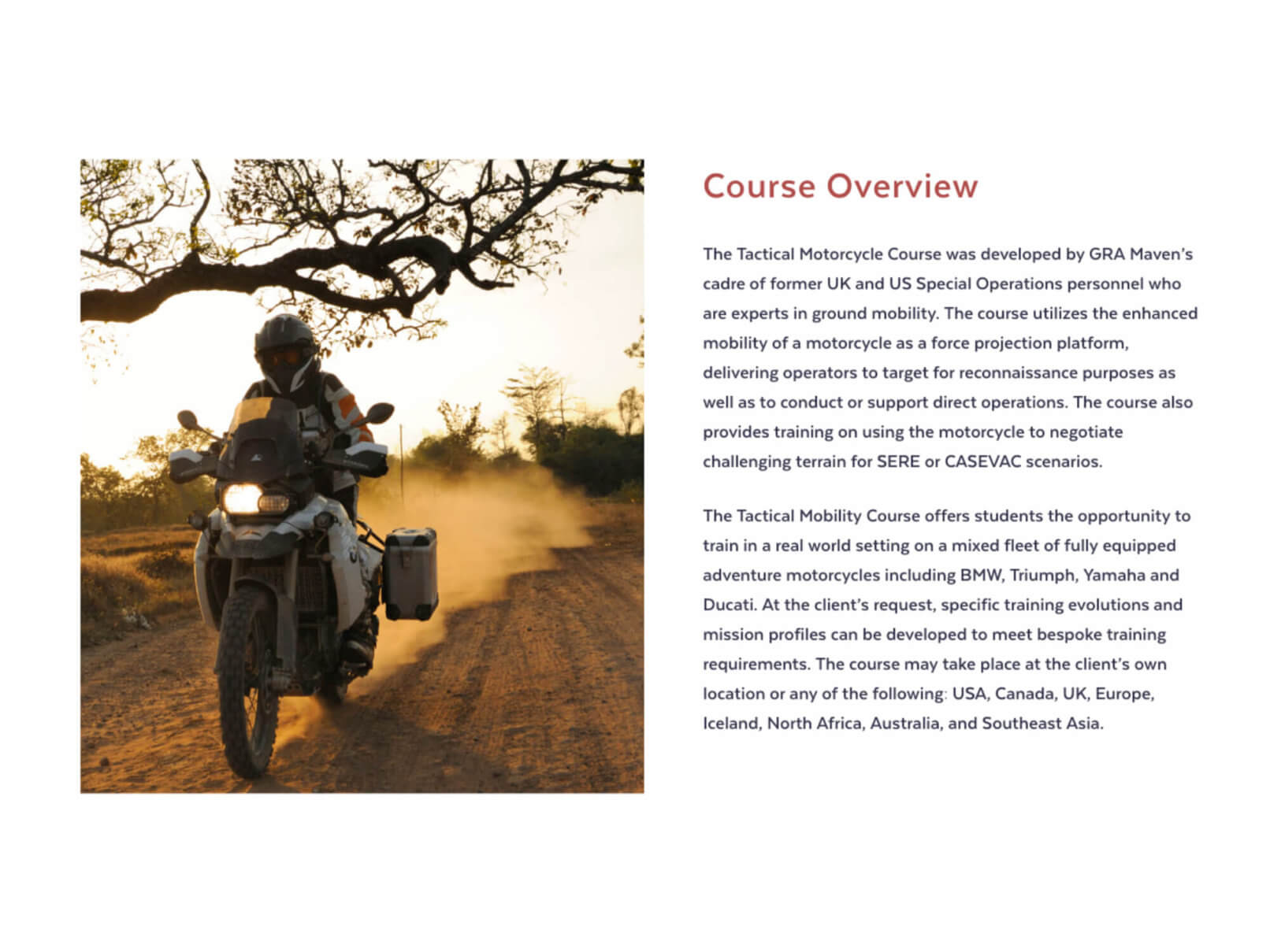The GRA Maven website has a wholly different feel from those of its sister brands, yet still speaks a similar language. Built on a custom WordPress framework and optimized for viewing across multiple devices, the website places GRA Maven’s course offerings in the spotlight with clear, simple navigation. Leveraging the awesome visuals was paramount throughout the GRA Maven brand, so the design has a deliberate supportive feel—thoughtfully pairing content with imagery and reducing distracting elements. Each course has a supplementary downloadable asset that contains additional information. The site also features a password-protected gate for sensitive content.