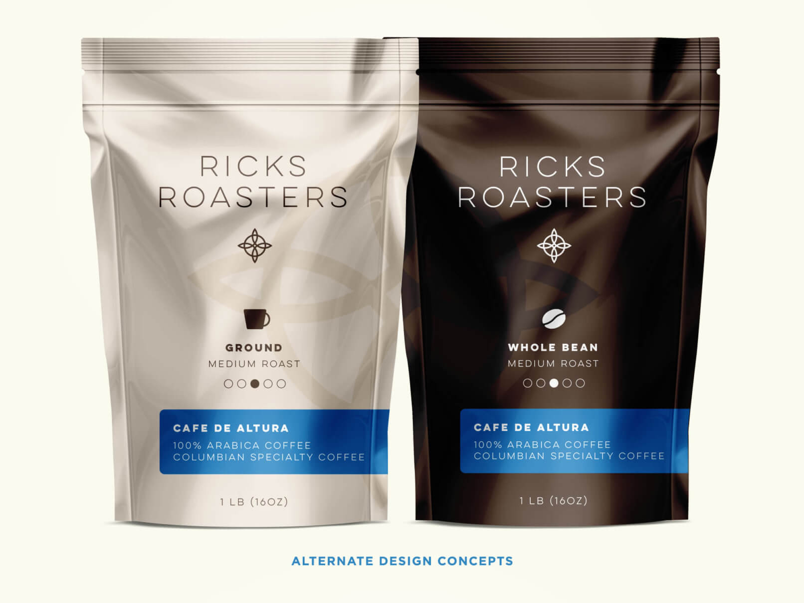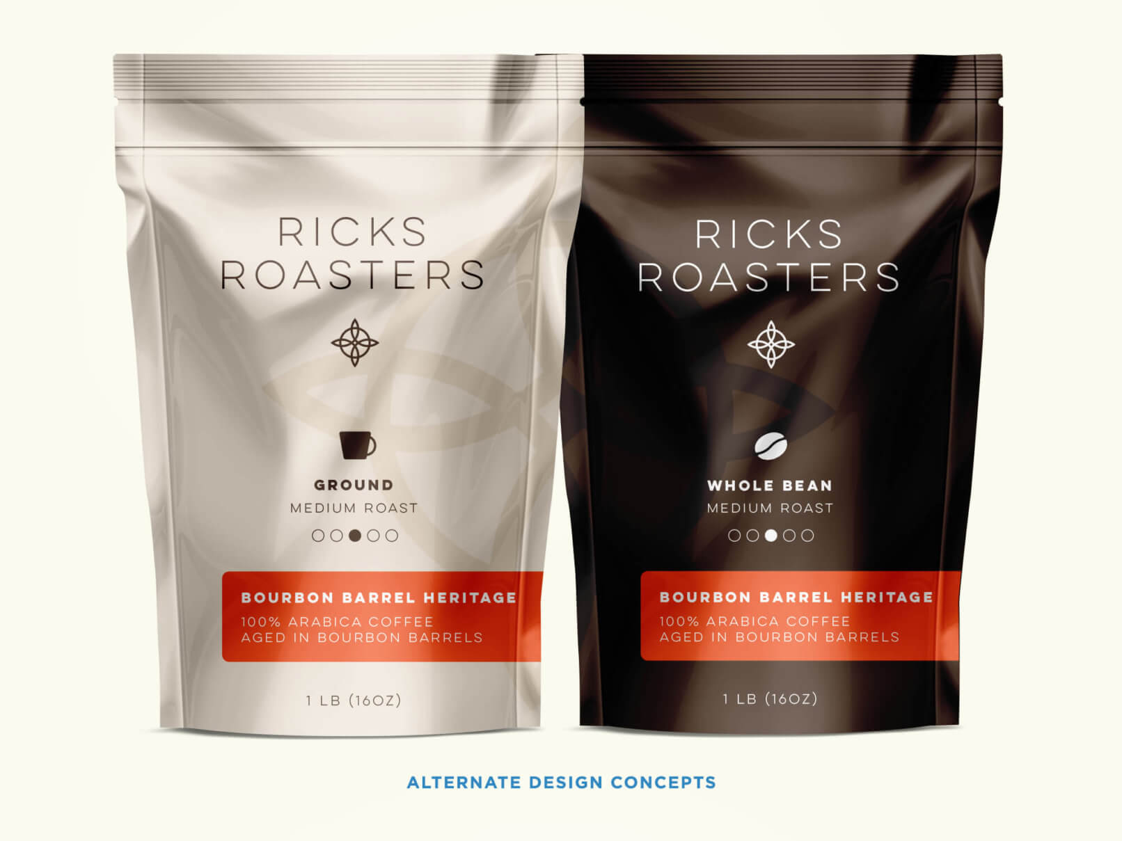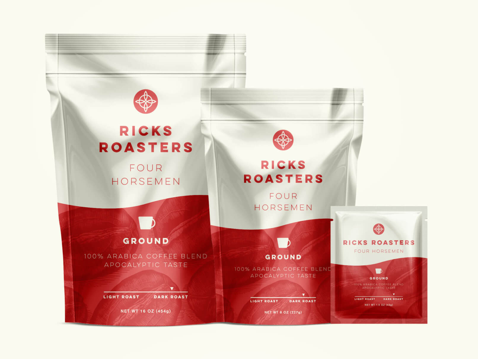 Ricks Roasters hired Pig Iron to redesign their coffee packaging to be more consumer friendly and approachable while also improving overall brand recognition on shelves. The new brand incorporates a knot motif from their previous identity and pairs it with bold, highly legible text to be effectively spotted from a distance. We developed a packaging system that leverages bright, vibrant colors, a smooth wave shape, and a custom etched-style coffee bean illustration that was created in-house to instantly connect all the products together. Each variety has its own distinct color for at-a-glance identification. A simple system for identifying roast level and grind completes the package.