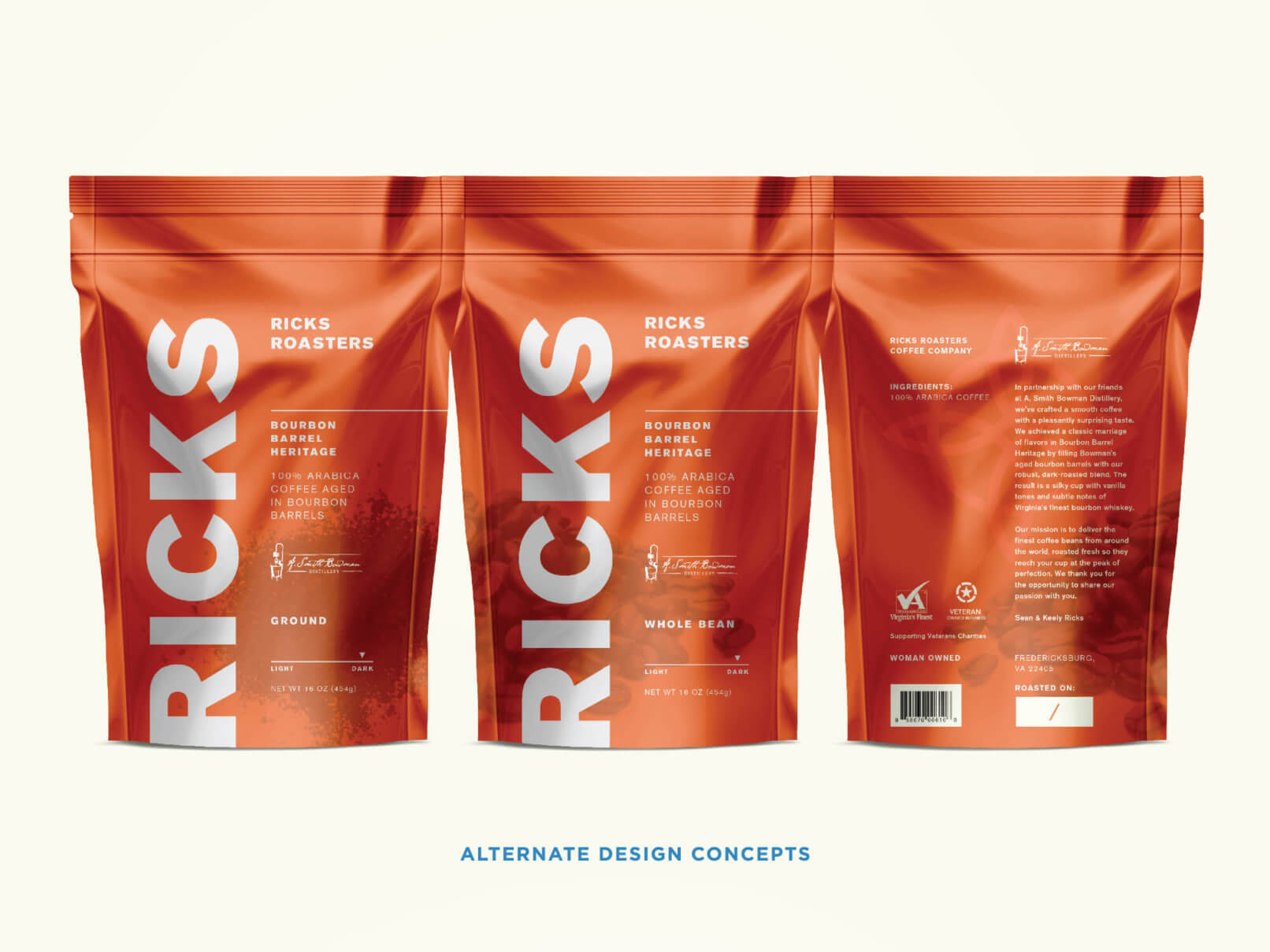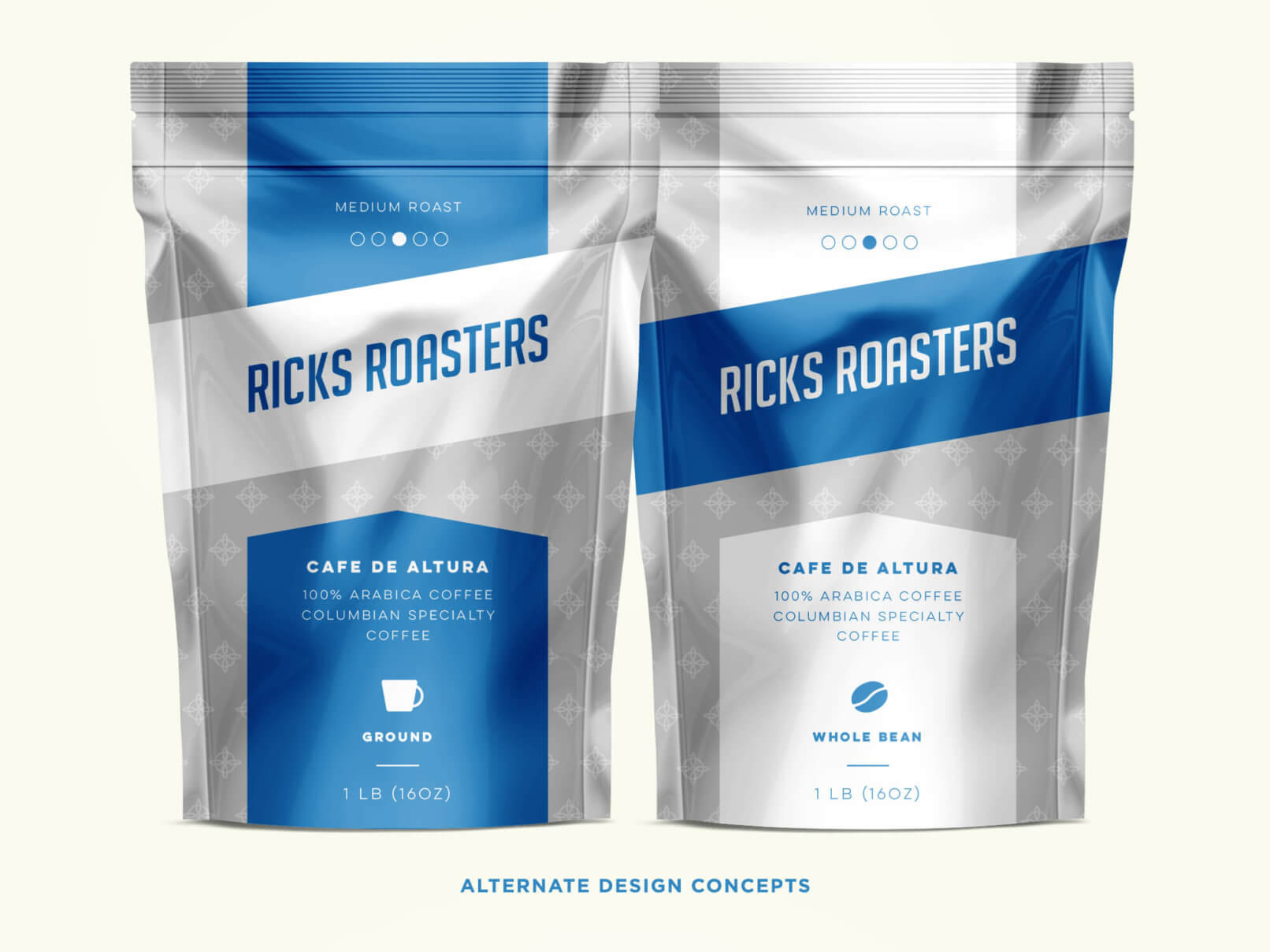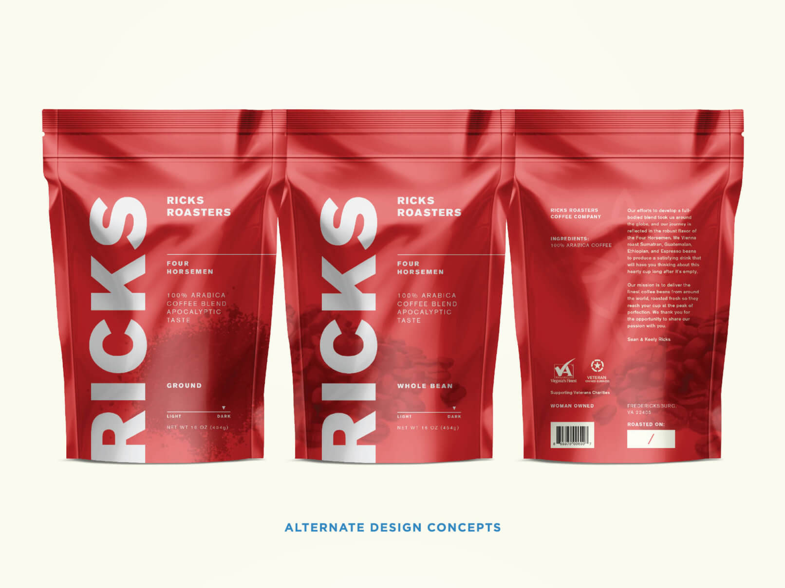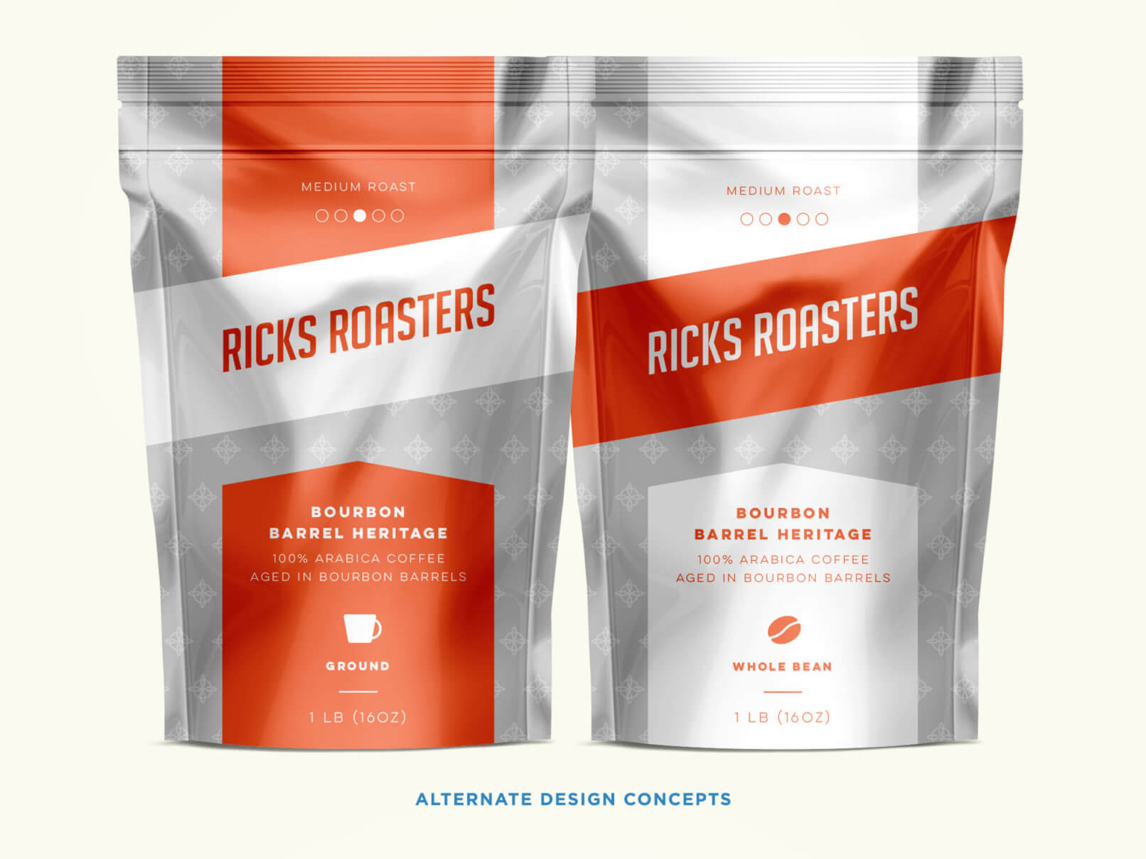 Ricks Roasters hired Pig Iron to redesign their coffee packaging to be more consumer friendly and approachable while also improving overall brand recognition on shelves. The new brand incorporates a knot motif from their previous identity and pairs it with bold, highly legible text to be effectively spotted from a distance. We developed a packaging system that leverages bright, vibrant colors, a smooth wave shape, and a custom etched-style coffee bean illustration that was created in-house to instantly connect all the products together. Each variety has its own distinct color for at-a-glance identification. A simple system for identifying roast level and grind completes the package.