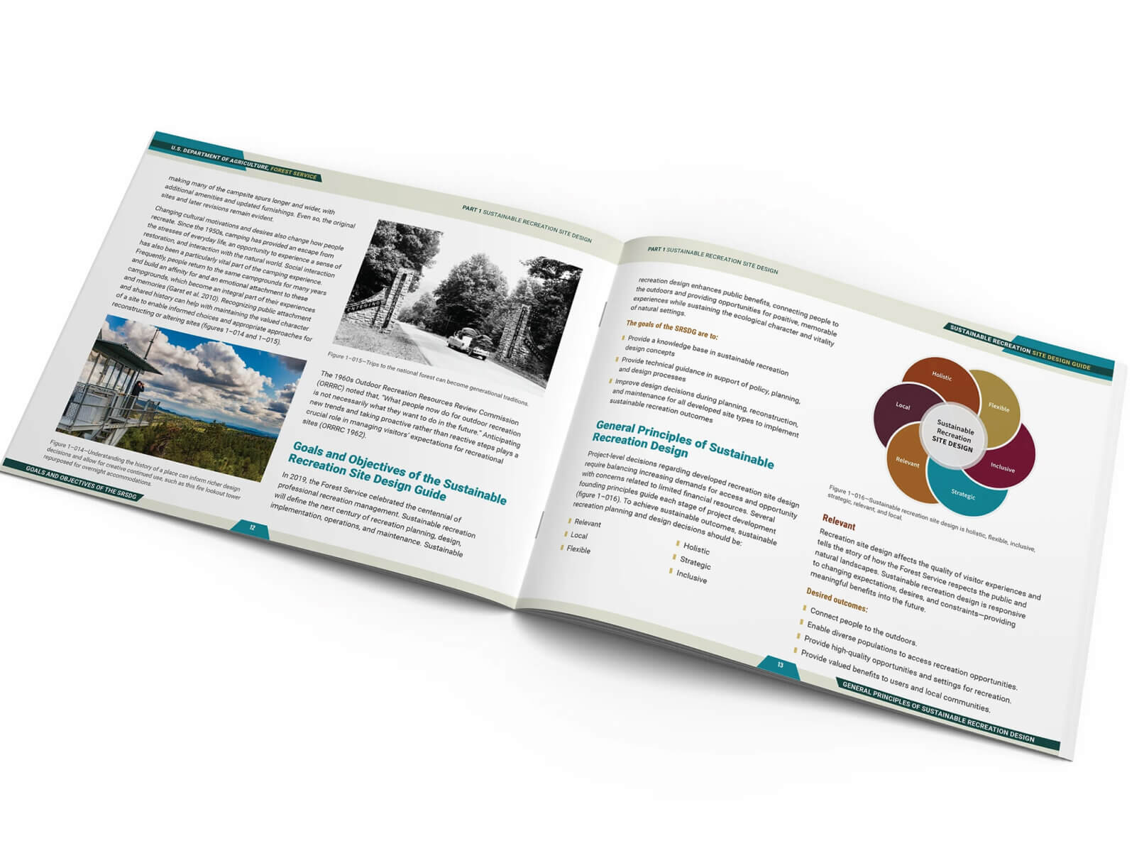 The “Sustainable Recreation Site Design Guide” (SRSDG) is a technical guidebook that describes the best practices and processes for implementing sustainable recreation design into U.S. Department of Agriculture, Forest Service recreation projects at the site scale. The SRSDG helps field staff with planning and designs for new construction and for reconstruction of existing recreation facilities and sites, while also considering the three spheres of sustainability—social, environmental, and economic.